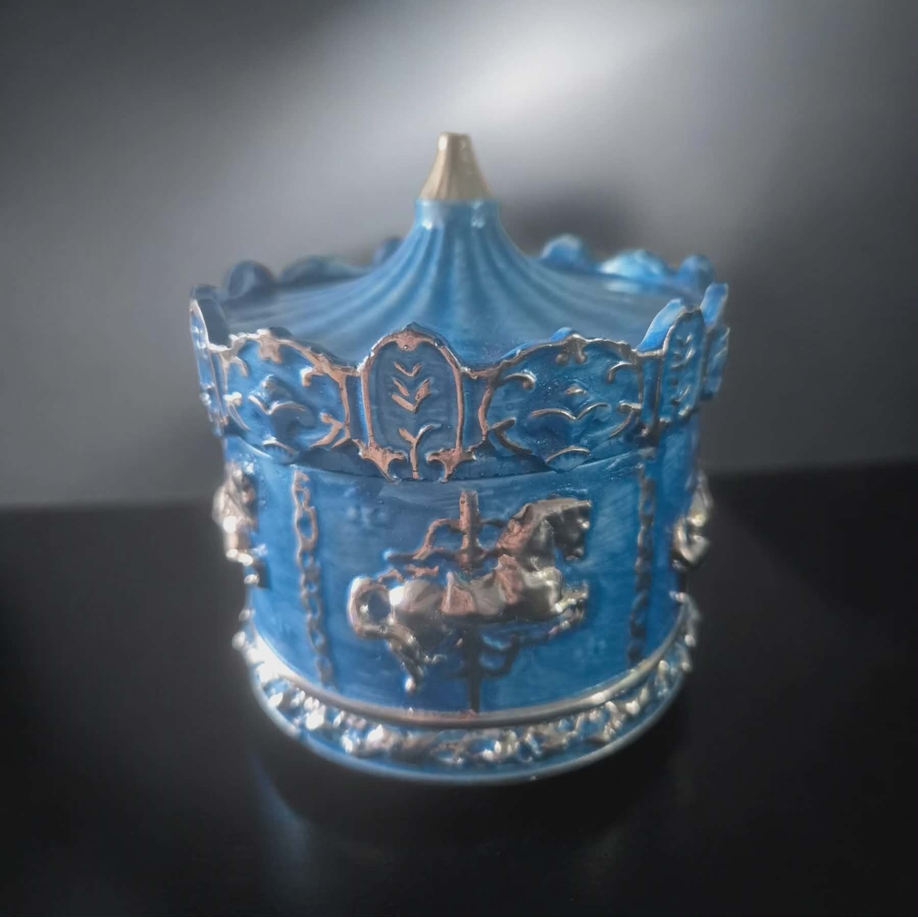Bring home the amazing soft scent of sandlewood and warm musk with our beautiful candle. This candle sits in our handmade ceramic carousel candle pots coloured and created by us, allowing you to have this fabulous product in your home that doesn't get hot.